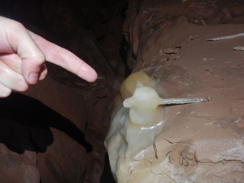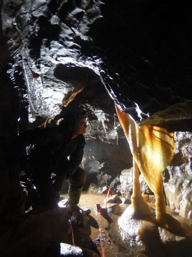 We made it up Skyhook and were immediately impressed by the pretty formations at the top. We wandered through some more passage, eventually splitting in half so Ade and Asher could do some professional photography, while me, Viki and Tyler carried on to see if we could make it to the Marble Showers traverses. We continued on through many formation-filled passages. Every time the tape ended we thought that was it, and then we’d turn a corner to find more tape and more pretties. The coolest one had to be the Stalactite that transformed into a curtain, which flowed down into a straw and then joined a stalagmite, with a teeny tiny helictite coming off the side.