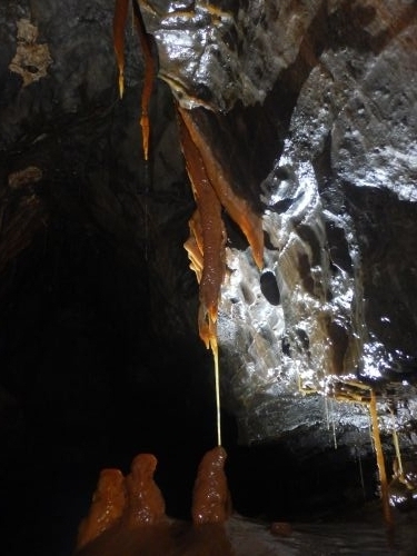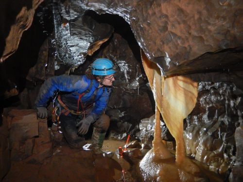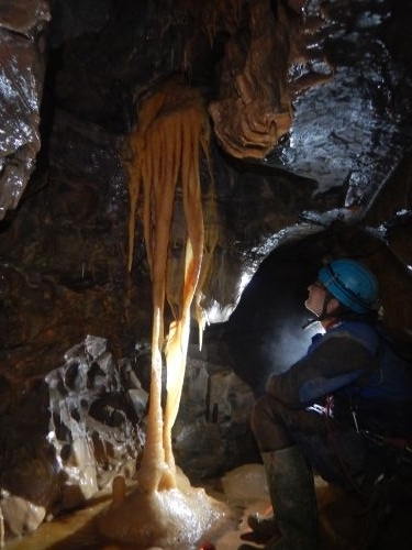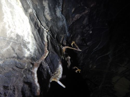 Eventually we made it to the freshly bolted pitches that Viki wanted to try and rig. They were quite spectacular and incredibly out of character for a Wales cave. They could have been taken straight from the Dales. We got down and explored some more pretty passages. A very cool, right-angled helictite was probably the highlight here.